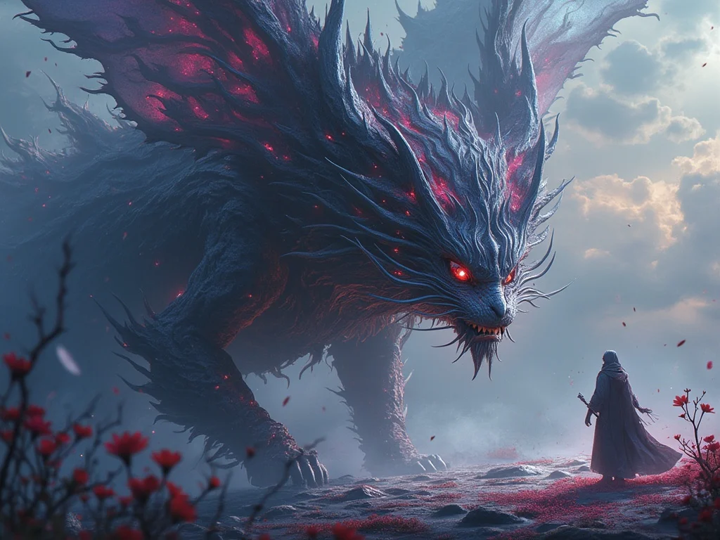 Seine Kampfausrüstung unterstreicht den furchteinflößenden Eindruck zusätzlich. Die schwere, schwarze Plattenrüstung mit gezackten Elementen verleiht ihm eine aggressive Silhouette. Das breite Schwert mit gezahnter Klinge dient nicht nur als effektive Waffe, sondern symbolisiert auch seinen Rang als Anführer.